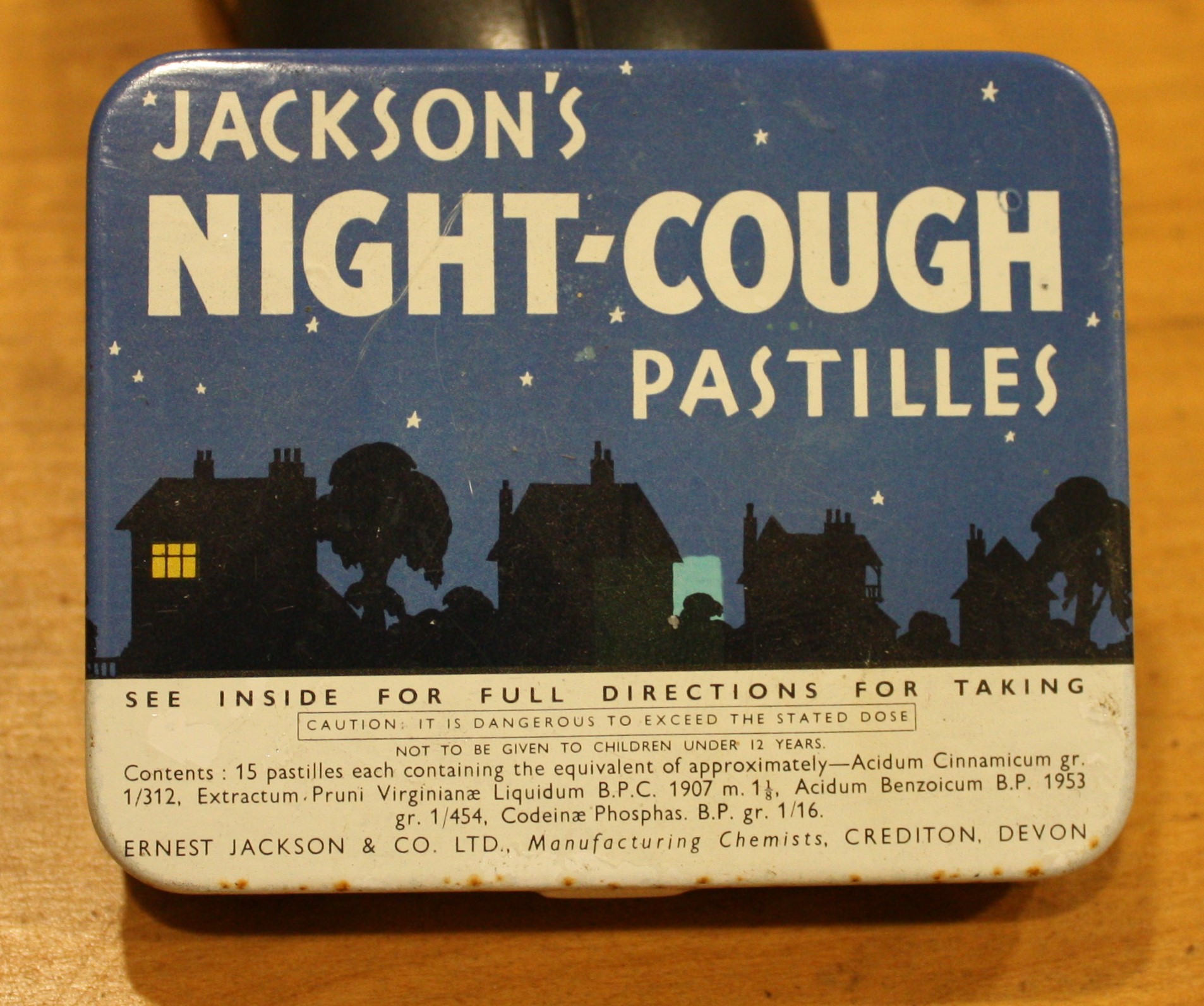 Ernest Jackson & Co., Ltd., Manufacturing Chemists, Crediton, Devon., “Night-Cough Pastilles Tin,” Emsworth Museum, accessed April 17, 2026, https://mail.emsworthmuseum.org.uk/emcms/items/show/9647.