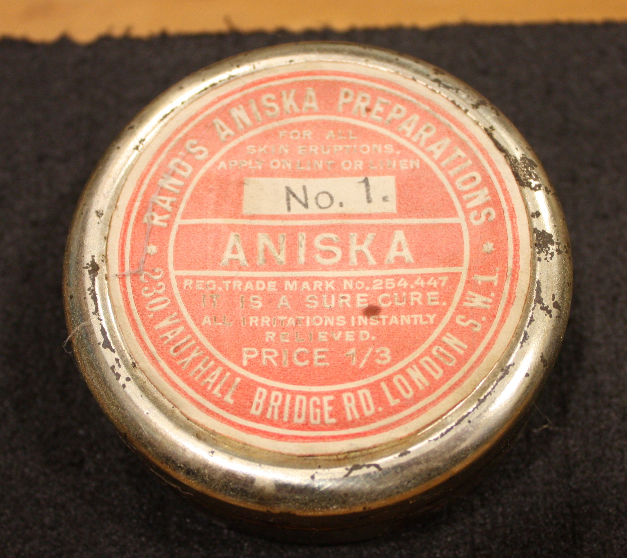 Round tin with a Sticker on the lid printed with: RANDS ANSIKA PREPARATIONS NO. 1 ANISKA for all skin eruptions apply on lint or linen.. IT IS A SURE CURE. ALL IRRITATIONS INSTANTLY RELIEVED, PRICE 1/3. 230 Vauxhall Bridge Road, London SW1. Tin is 65 mm in diameter by 23 mm in height.