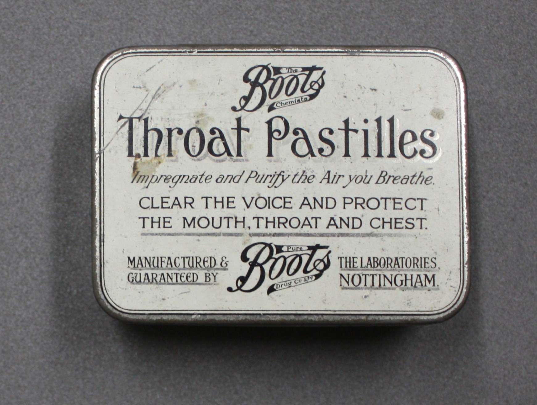 Boots Laboratories, Nottingham, “Tin of Throat Pastilles,” Emsworth Museum, accessed April 16, 2026, https://mail.emsworthmuseum.org.uk/emcms/items/show/9651.