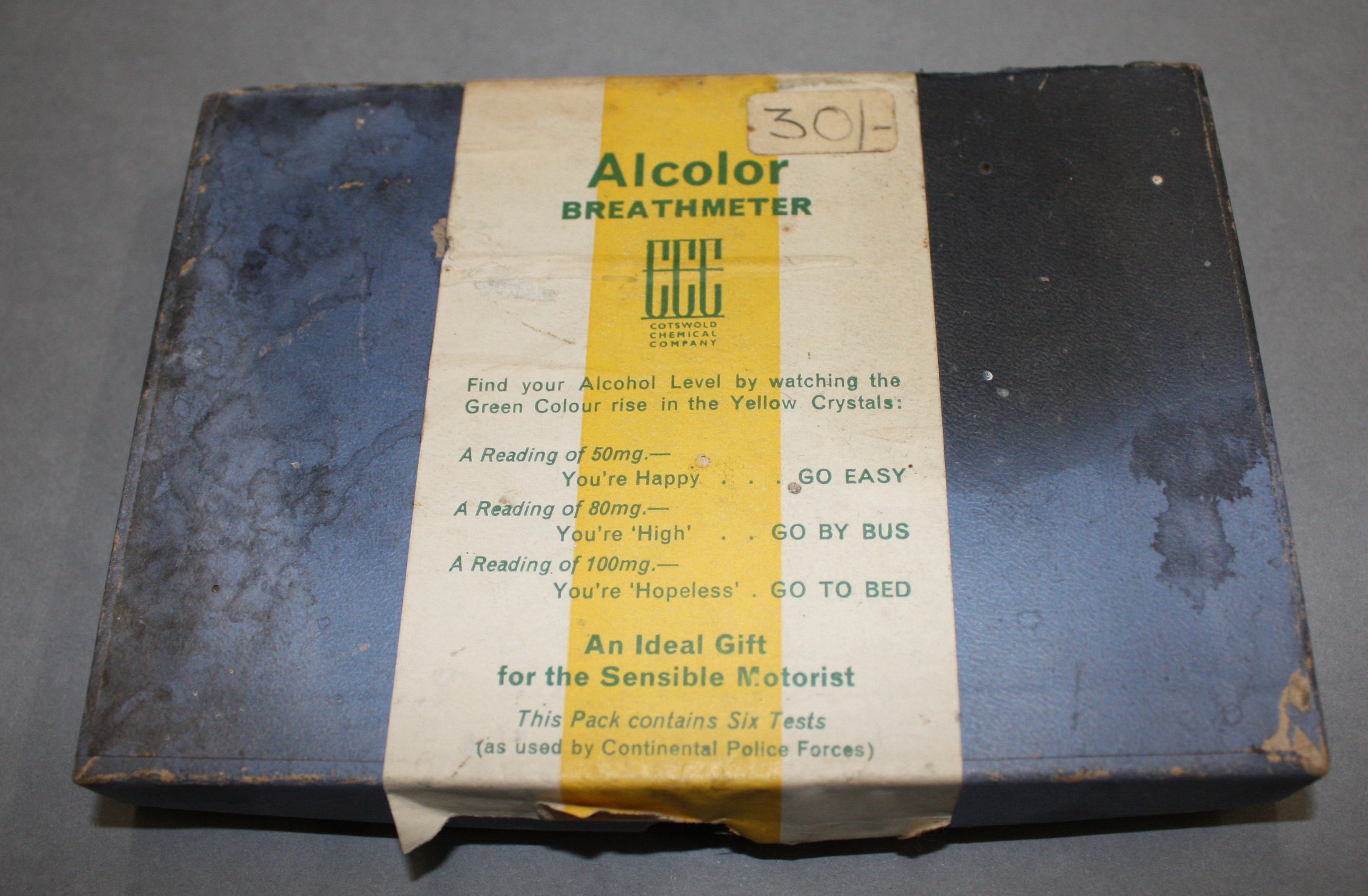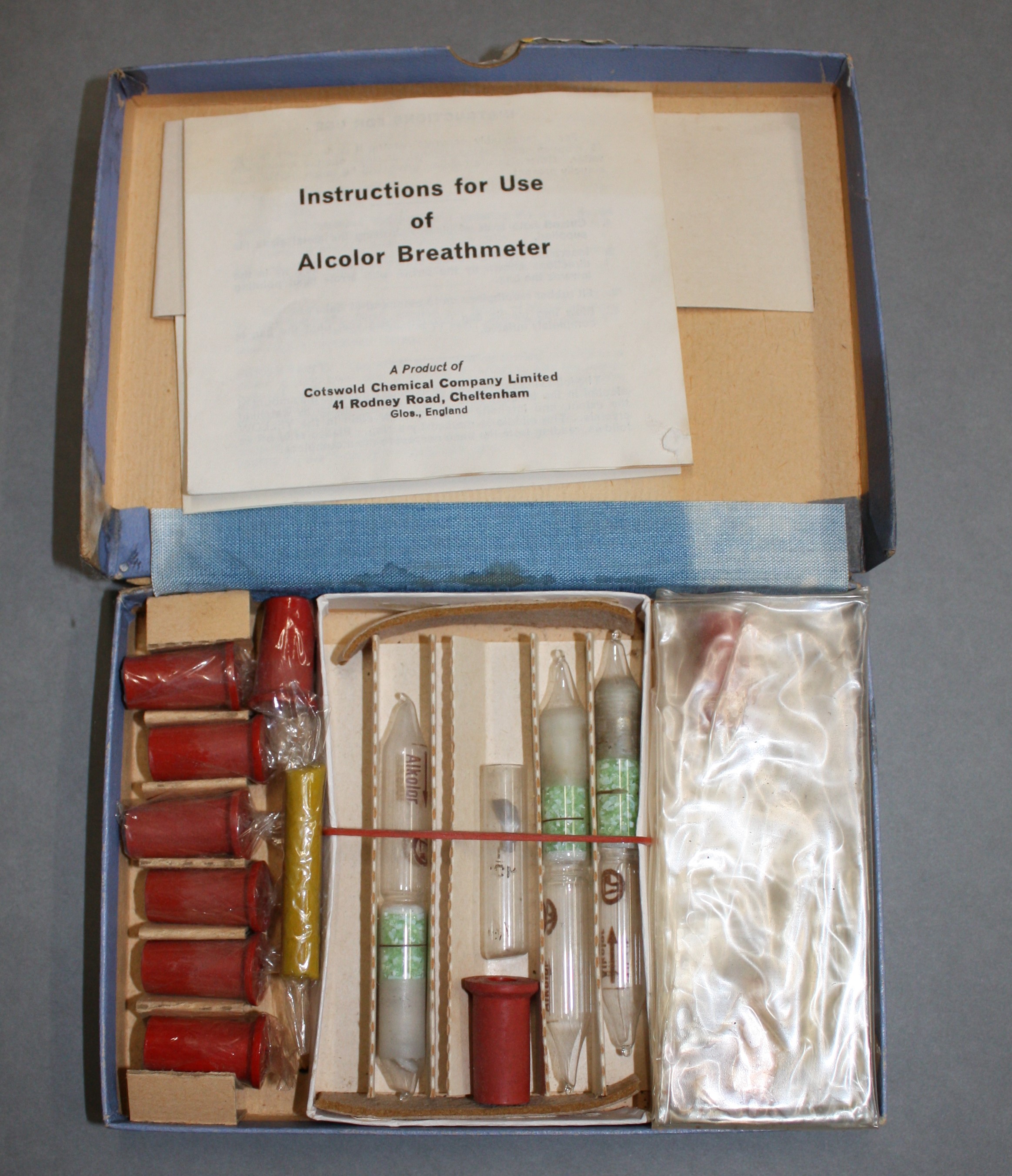 One of the first commercially available, practical breathalyzer's. Sold in its day for 30 shillings and came in a box 16.5 cm x 115 cm x 20 cm including two instructions for use. It consists of glass vials, a metal glass file, plastic bags and rubber mouthpieces. When blowing into the plastic bag the breath is exposed to, originally yellow crystals, now green, marked with a red line about half way up the column of crystals. In essence, a guide to the level of alcohol in the bloodstream is indicated by the yellow crystals turning to different intensities of green and how far up the column the colour extends. For example, 30 mg of alcohol per 100 mg of blood shows the first signs of green in the lowest part of the vial; 50 mg an easily recognisable green in the same area with this level being the permitted maximum; 80 mg a more intense green covering the whole of the vial below the red mark; 100 mg produces an intense green beyond the area of the red mark. The pack contained six tests.