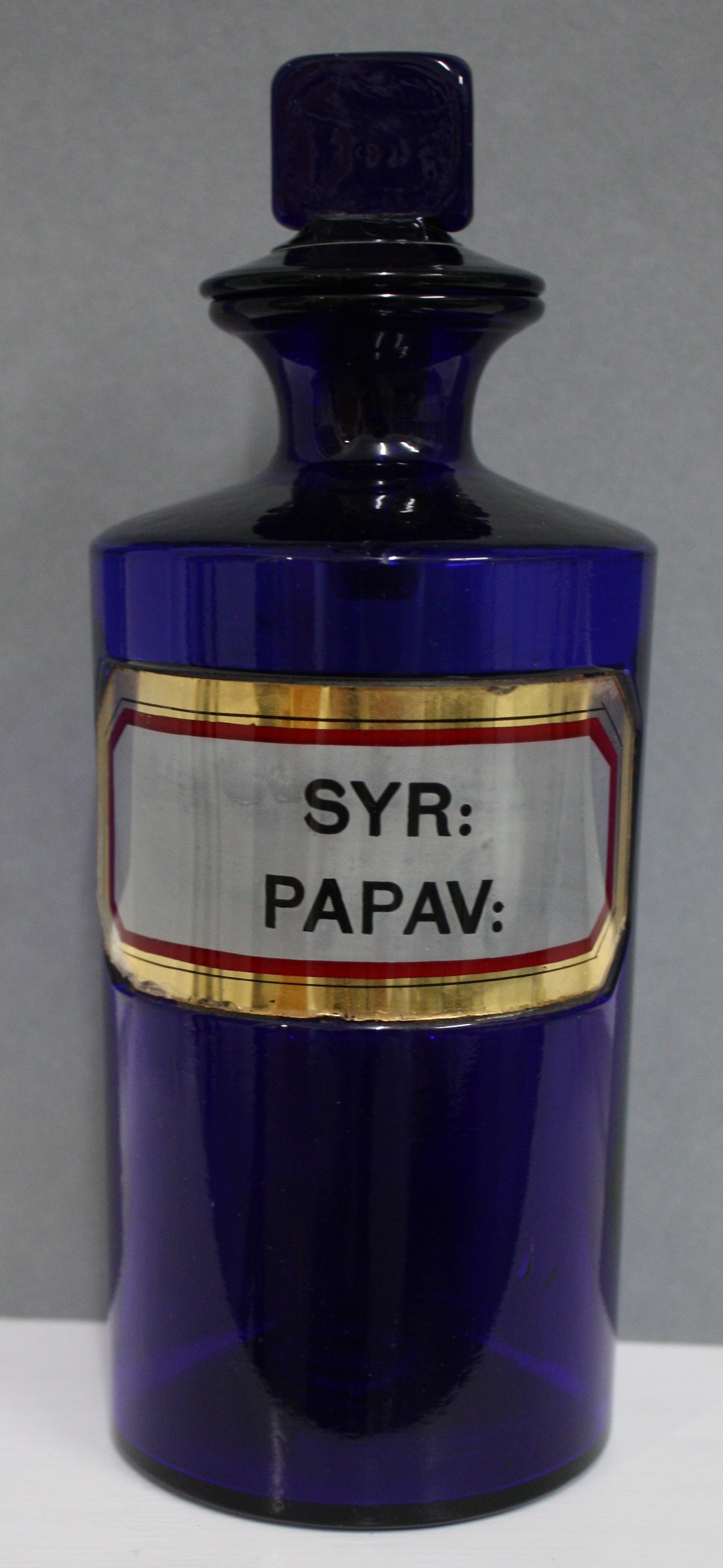 Blue bottle 170 mm x 80 mm with a neck for the stopper. The label carries the words SYR PAPAV - essentially poppy syrup made from the fresh petals of the white or opium poppy. This was used as an expectorant for treating coughs.