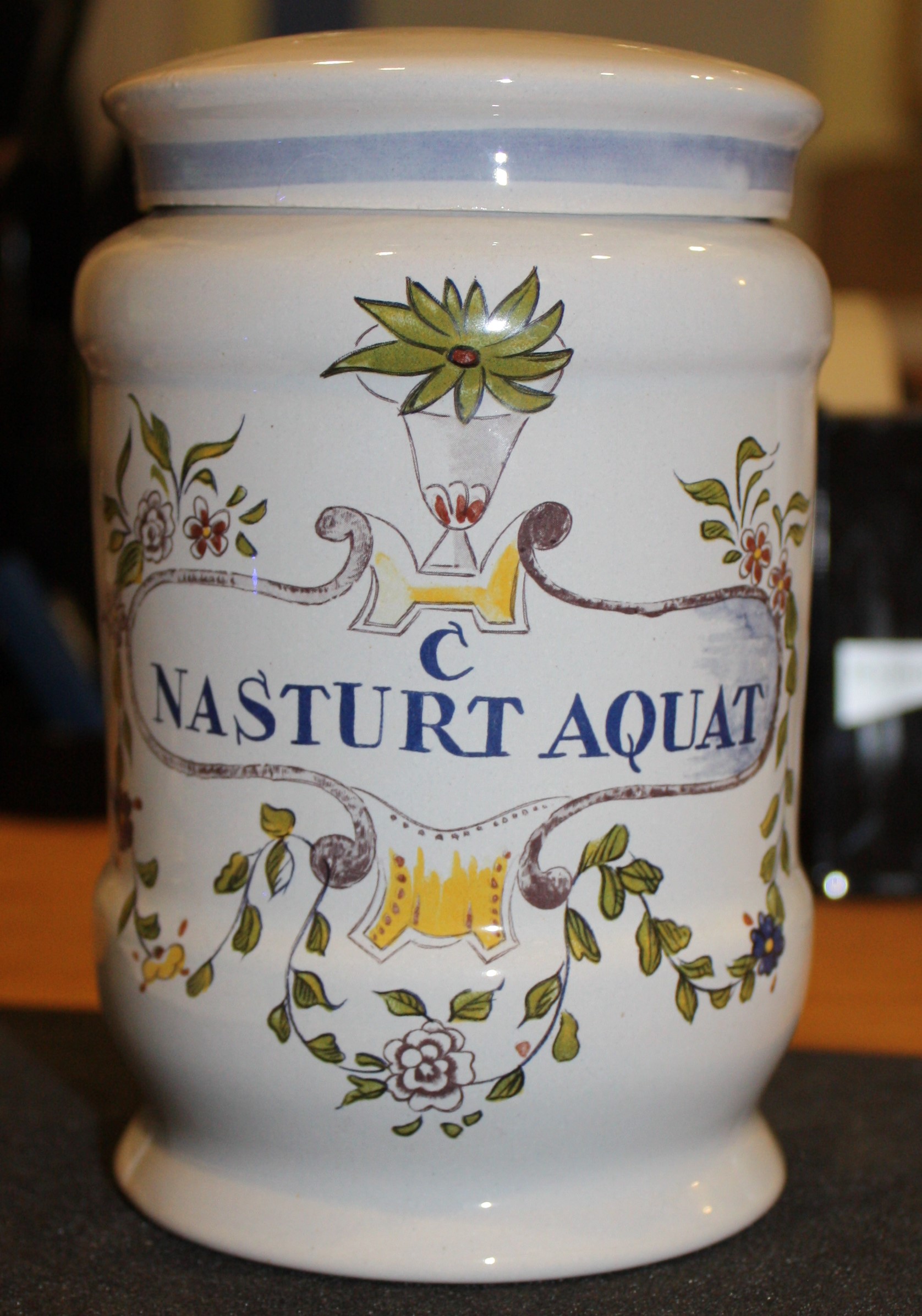 White jar with white lid (separate). Jar- 14cm x 20cm. Lid- 9.5cm x 9.5cm. Front of jar has flower decorations and the words 'nastur[c]t Aquat [Nasturtium Water?]. The c is added over the top. Lid has blue line around screw section. Very good condition- some chips on inside of lid and on base of jar.