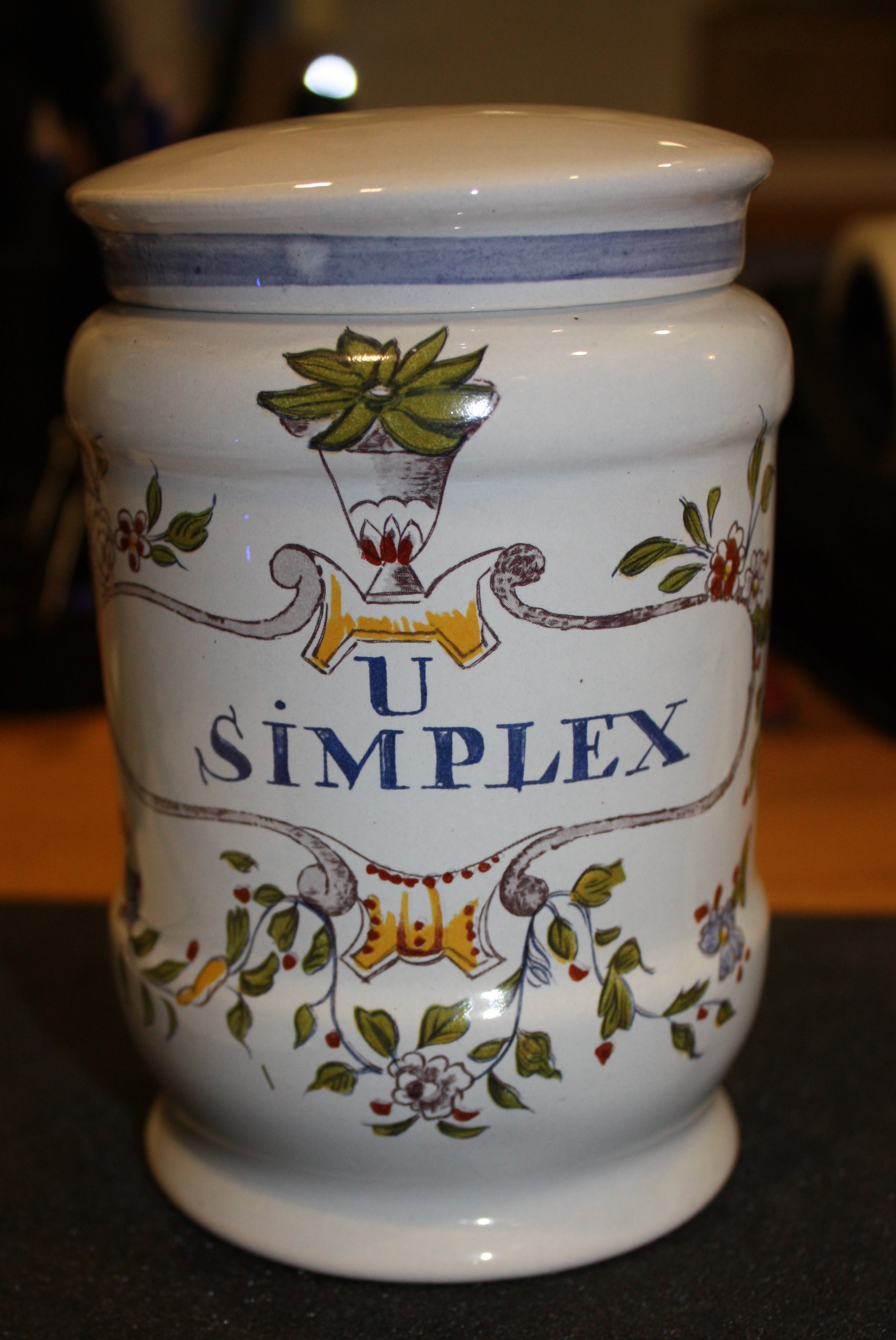 White jar with white lid (separate). Jar- 14cm x 10cm. Lid- 9.5cm x 9.5cm. Front of jar has flower decorations and the words 'Sim[u]plex''. The u is added over the top. Lid has blue line around screw section. Very good condition- some chips on inside of lid and on base of jar.