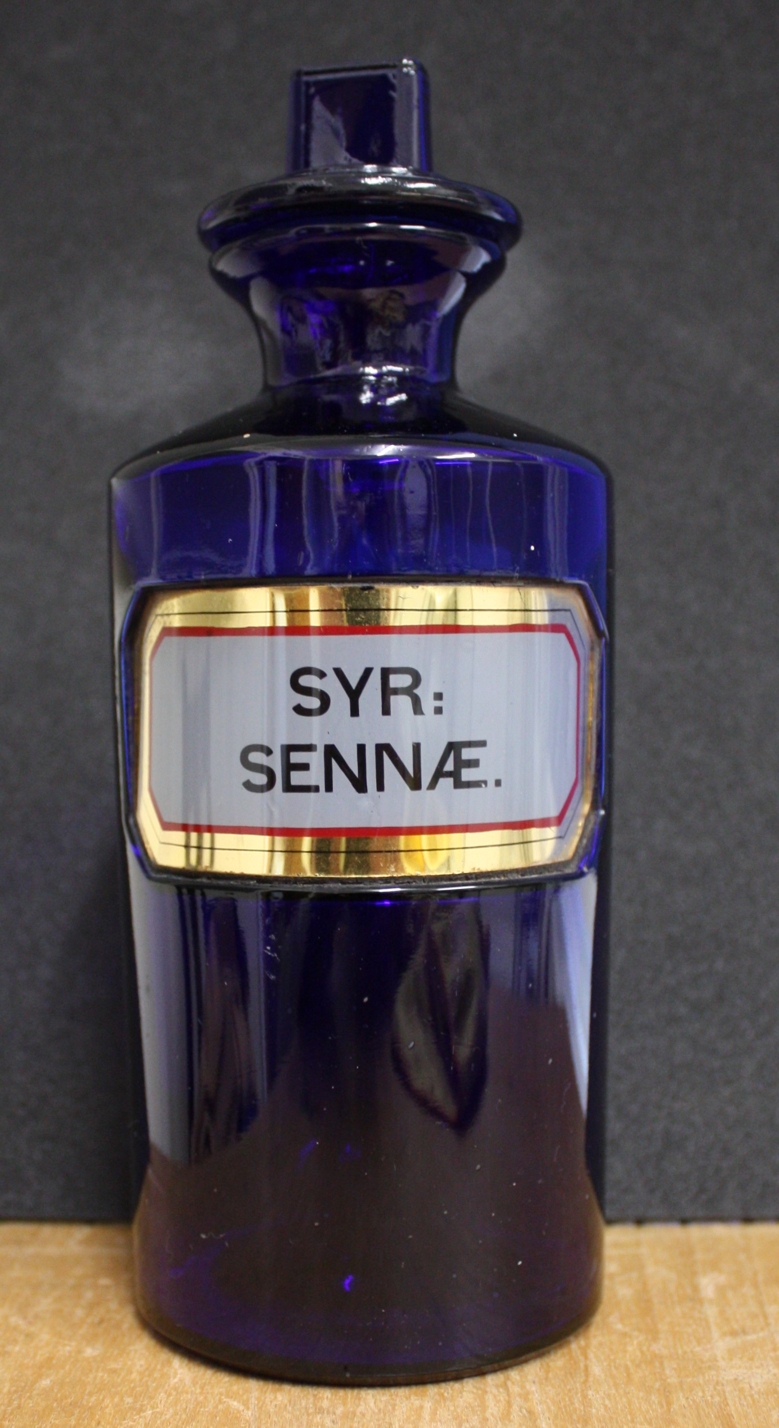Blue glass bottle comprises two parts, the main body 175 mm x 80 mm with a neck for a separate stopper. The label states SYR SENNAE:. The bottle and stopper are in good condition.