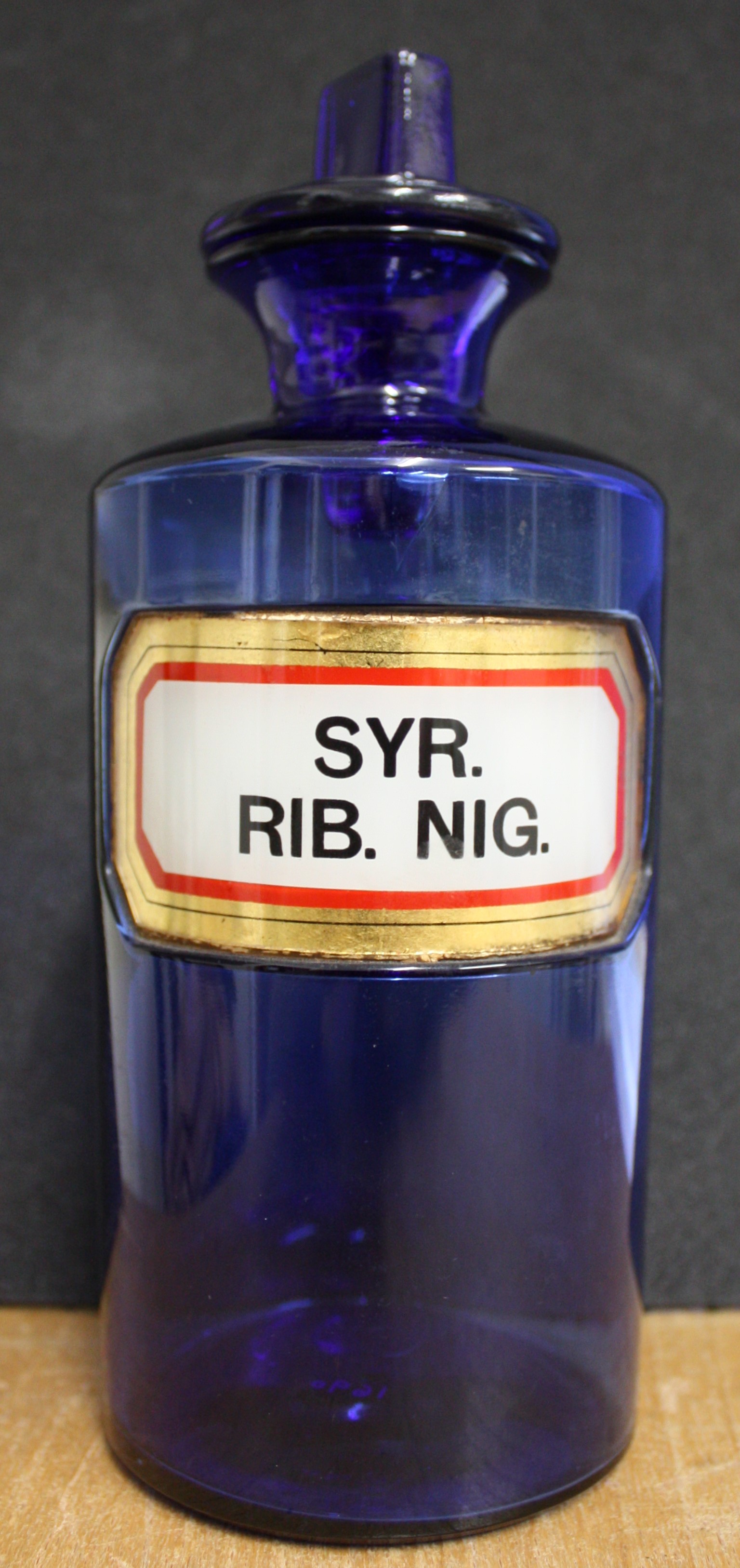 Blue glass bottle comprises two parts, the main body 175 mm x 80 mm with a neck for a separate stopper. The label states SYR. RIB. NIG. The bottle and stopper are in good condition.