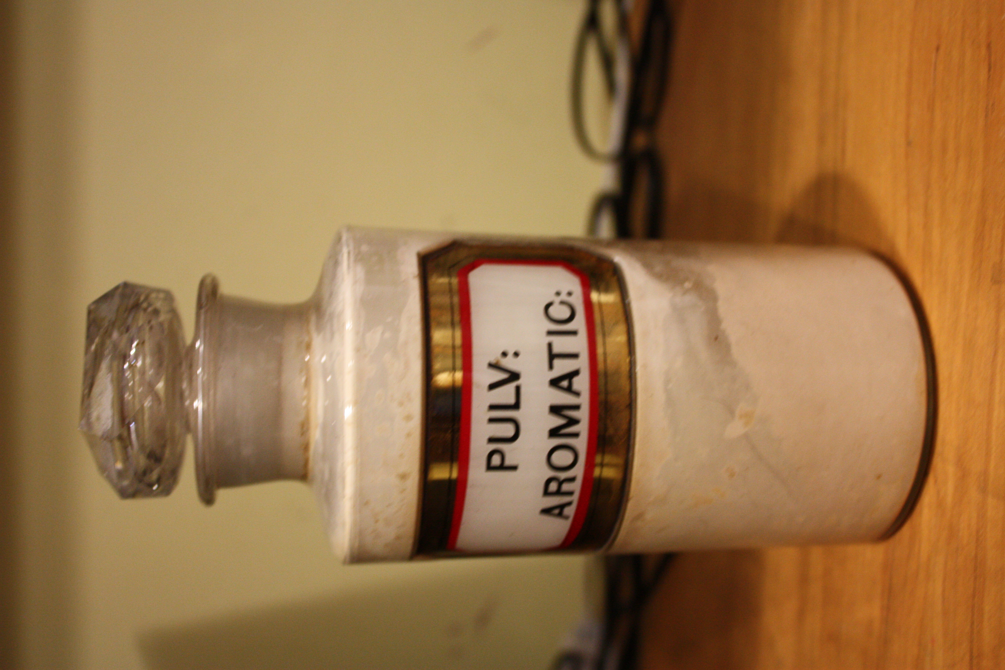 Glass jar. 7cm x 18.5 cm with stopper 4.5cm x 4cm. White, red & gold label on jar 'Pulv: Aromatic' (Aromatic Powder). About 1/6 of contents remaining in jar. Yorkshire Glassware Company mark on bottom of jar. Original label is also still visible on bottom of jar. Good condition- Bottle has some general marking on inside of jar where powder has dried and scored brown marks on back