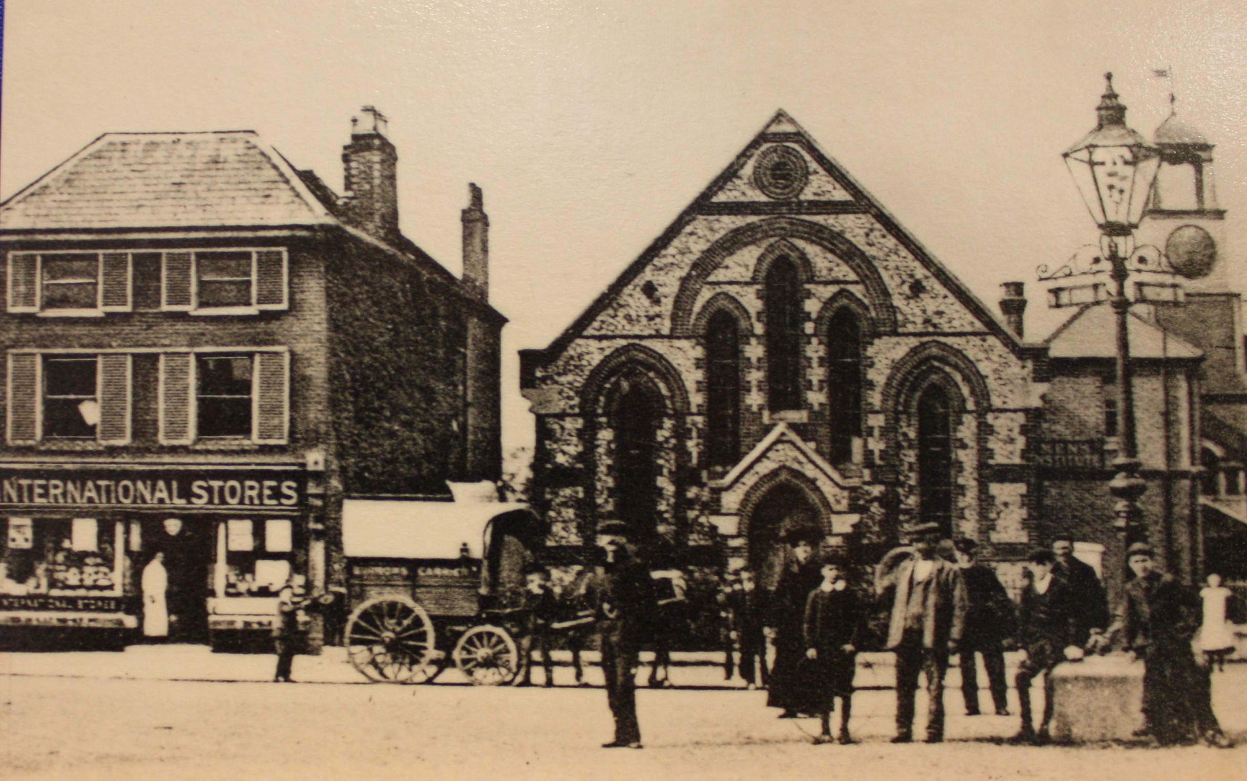Monochrome depicting a group of men and youths if the foreground with the International Stores and the Men's Institute in the background. Good condition 15 cm x 10.5 cm