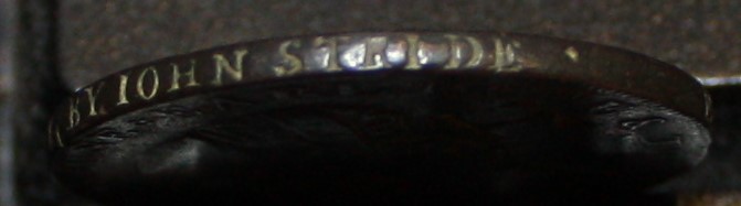 George III halfpenny with the obverse inscription around the periphery reading: EARL HOWE & THE GLORIOUS FIRST OF JUNE. The image in relief is of Richard Howe, 1st Earl Howe (1729-1799). There is also a large stamped 'H' to the left of the head. The reverse side shows Britannia with the inscription around the periphery: RULE BRITANNIA 1795. On the coins edge is the following inscription: HALF PENNY PAYABLE BY JOHN STRIDE EMSWORTH